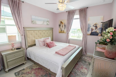 At the back of the villa on the upper floor, you'll discover Bedroom 4, providing a King-size bed and sharing an en-suite bathroom with Bedroom 6, a vibrant music-themed room furnished with a Queen-size bed. Bedroom 5, situated at the front of the upper floor, showcases a King-size bed and shares an en-suite bathroom with Bedroom 7, an enchanting Disney-themed room featuring Twin beds. For younger family members with a penchant for dressing up and singing karaoke, Bedroom 8 is the perfect haven. Complete with Bunk beds, a stage, a karaoke machine, and a wardrobe brimming with outfits that would delight any Disney Princess, this room promises endless fun and imagination.