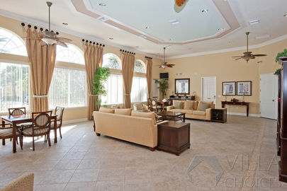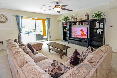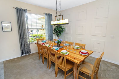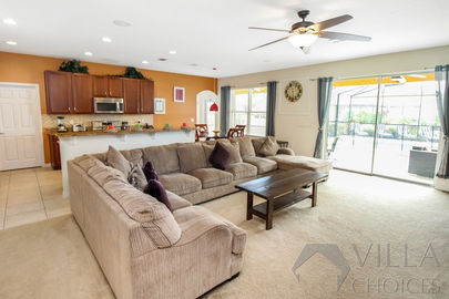 On the left side of the villa entrance, you'll find a spacious dining table, providing ample room for everyone to gather and celebrate special occasions or enjoy an entertaining evening filled with board games and laughter. Adjacent to the dining table, the family lounge awaits, featuring a comfortable corner sofa arranged in front of a large flatscreen TV, creating an ideal setting for memorable movie nights with your loved ones. The lounge also grants access to the inviting pool deck, where you can bask in the glorious Florida sunshine.